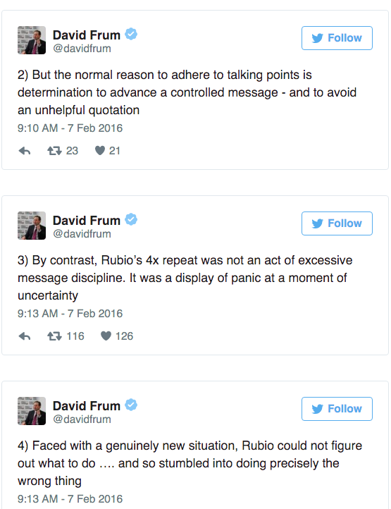 This was flat-out panic and mental paralysis. (And I see that the Atlantic’s David Frum has made the same point, to devastating effect.) The central problem was that Rubio used an odd-sounding construction that might come out of a real person’s mouth once but that no one would naturally repeat. It was: