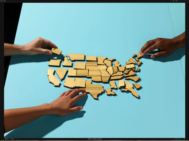 America is like a puzzle that’s been pulled apart (or broken apart). The question is: Can America put the pieces back together? That’s the concept for our cover image. For the photo I reached out to the brilliant team of Adam Voorhes and Robin Finlay.