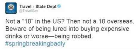 Some questions: Has the State Department’s social media team started spring break early? Has the State Department indulged in a few too many expensive drinks? Is the State Department … negging spring break travelers?