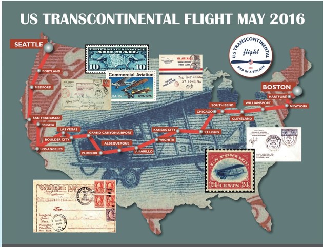 2) Less good news: Tracey Curtis-Taylor. Ms. Curtis-Taylor, who has been doing long-distance flights all around the world, began this spring a biplane trek across the country, Seattle to Boston, recreating the route of the old air mail pilots. This past week her trip was interrupted by a (non-injury) crash in Arizona. Glad she is OK, hope (as with Solar Impulse) that the trip resumes. Map below:
