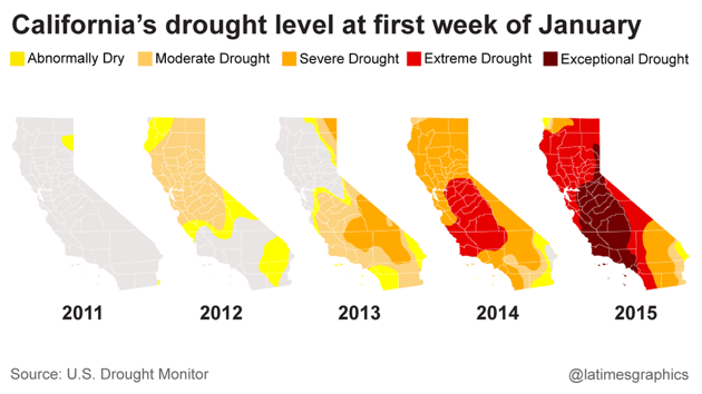 The rains of the past El Nino season have slightly offset the disastrous multi-year drought in California, which is the worst in the state’s recorded history. Just in case you skipped through that previous sentence too quickly: for as far back as weather records have been kept, there has never before been as long or severe a shortage of rainfall as what California has endured since 2012. (Tree-ring records show prolonged droughts in much earlier eras, some lasting for centuries.) Some reservoirs in northern California have been partly refilled by the recent rains; most in the south are still very dry. The water supply is nowhere close to back to normal, and what the new “normal” might be no one can say.