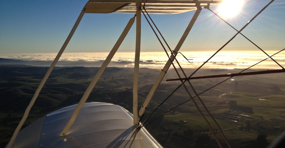It was taken while bundled up in an open-cockpit 1932 Waco UBF-2. Off the wingtip is Tomales Bay, under which runs the San Andreas Fault. Point Reyes National Seashore is just on its other side, under the fog. When the sun swings south in the fall, it bathes the earth and the Waco’s wings in a soft, glowing light. The sky flushes orange, the summer-brown grass greens, the air stills, and on this day, I could smell the gap between the temperature and dew point closing. Pure heaven, accessible only by air.