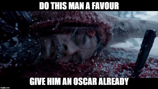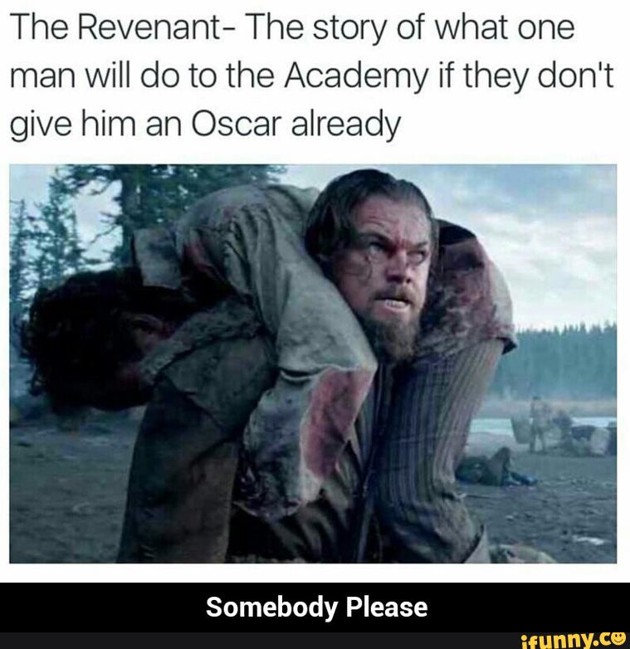 Christopher’s point about scoffing is a strong one, especially in the case of DiCaprio. The conventional wisdom during this past Oscar season was that DiCaprio—with five Oscar nominations but no wins before The Revenant—was so desperate to finally get a gold statue that he sought the role of an emotionally brutalized and physically tortured frontiersman (punctuated by a graphic mauling from a momma grizzly) and then prepared for the role by battling hypothermia, eating raw liver as a vegetarian, and sleeping in animal carcasses. It smelled desperate. And that desperation was widely mocked in memes: