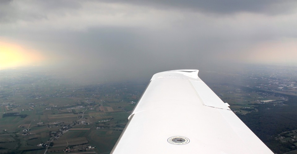 And sometimes we passed localized rain showers, always keeping a respectful distance. Here is how the area just over the Lancaster airport, in the heart of the Amish country of Pennsylvania, looked at about 4 p.m. on Wednesday, from 10 miles to the east, outside the rain. What looks like a cloud reaching all the way to the ground, off the plane’s wingtip, would have seemed to people in Lancaster to be a drenching downpour. The gray you see reaching from cloud to ground is rain.