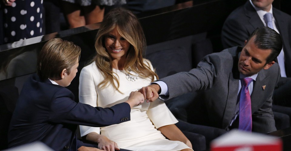 Donald Trump Jr., at right, with his brother Barron and stepmother Melania at the Republican convention. Today he weighs in about taxes.Carlo Allegri / Reuters