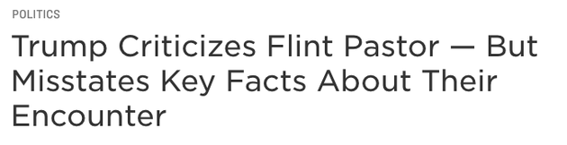 And it’s what you saw in this now-famous showdown in Flint, in which Trump meekly accepted correction in person from Pastor Faith Green Timmons, when she told him he was not supposed to be making a political speech—and then, once safely out of her gaze, flat-out lied about what had happened and had been captured on tape.