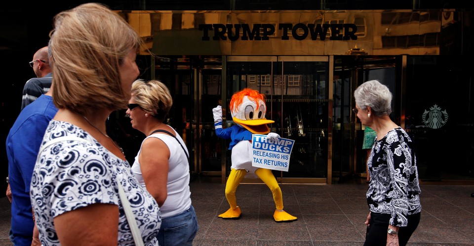 This guy, "D. J. Quacker," shown outside Trump Tower in New York yesterday, wants Donald Trump to release his taxes. So does a former commissioner of the IRS.Lucas Jackson / Reuters