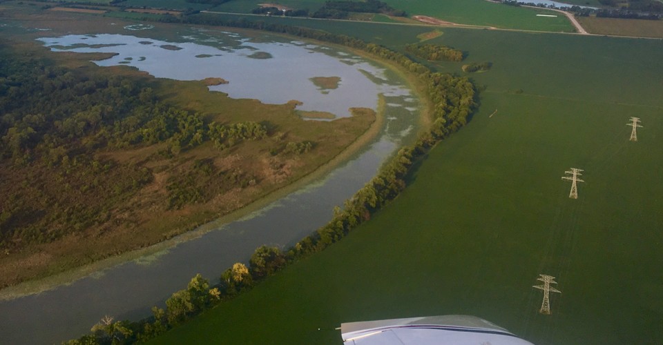In the foreground of the shot is Browns Lake, an ox-bow lake marking a vestigial course of the Missouri River that today flows in a man-made channel barely visible on the far side of the two power plants. The influence of human activity on the landscape represented in this photo is all encompassing: the course of a major river, the massive piles of Wyoming coal, the forest cover on the Nebraska hills in the background, the massive industrial complexes, and the farm fields that cover most of the ground are all anthropocentric artifacts. Only the ox-box lake and the wetlands on the interior of the loop are remnants of the natural world, and even they are heavily influenced by the power plants since they are part of the water management process that cools the outflow from the facilities.