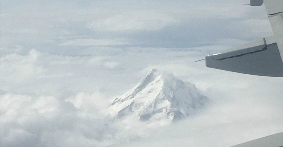 I fly into Portland frequently, and Hood is always impressive when the weather is clear. The mountain is a sentinel watching over the Columbia River Valley. This day in July 2016 was very cloudy, and I expected no views. But the undercast cracked just enough to reveal the upper slopes and summit of the 11,250-foot mountain.