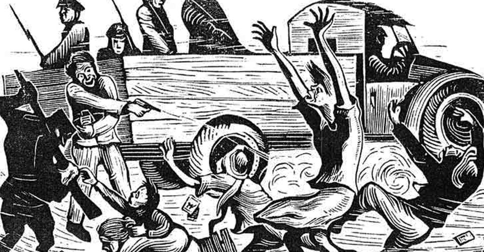 "The Terrible Inspection," a woodcut by Rong-zan Huang depicted a scene from the the February 28 Massacre, which "marked the beginning of the Kuomintang's White Terror period in Taiwan, in which thousands more inhabitants vanished, died, or were imprisoned. This incident is one of the most important events in Taiwan's modern history, and is a critical impetus for the Taiwan independence movement."Wikimedia