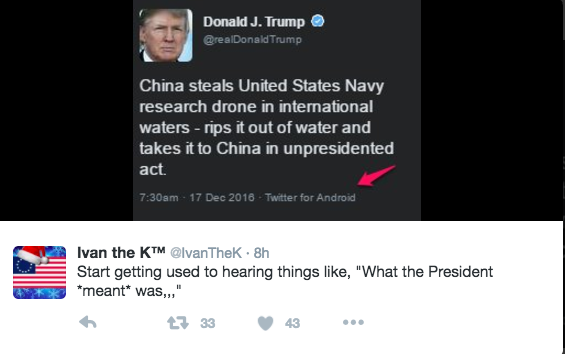 - Once Chinese officials determine that he’s not just kidding (the initial press reaction noted that Trump was still a private citizen, soon followed by editorials saying that he was “speaking like a child”), the leaders get their back up, and take their own unprecedented step of seizing this maritime drone;