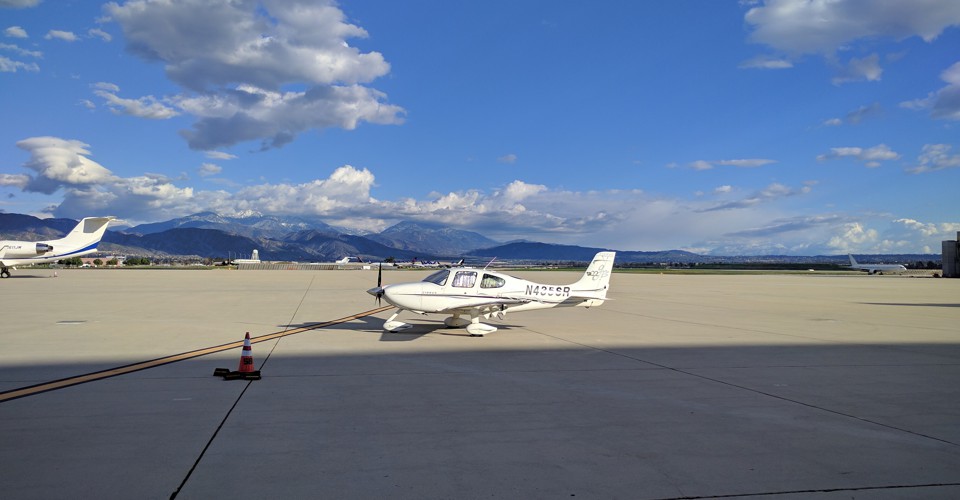 As it happened, we needn’t have worried. The turbulence didn’t materialize; the air was smooth. We spotted the San Bernardino Airport (SBD), and Jim set up the route for landing to the east. The pilot in front of us reported a “go around,” or missed landing, because the crosswinds were so gusty as he neared touchdown. He said he would circle around for a second try. Jim guided our Cirrus in, hovering near touchdown in the gusts for a few hundred feet and remarking to the controller that he was happy for the very long and wide runway at SBD, which had once accommodated B-52s when this site was the now-closed Norton Air Force Base.