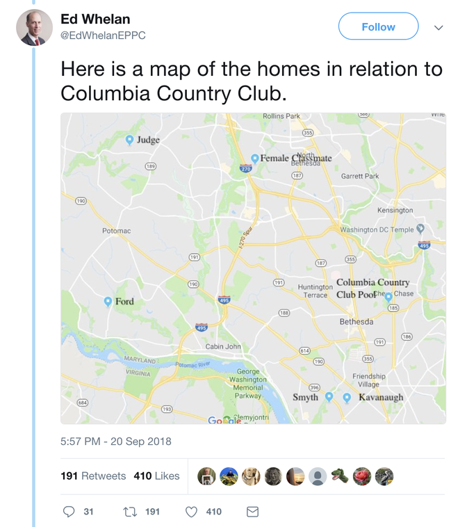 For instance, on Tuesday of this week Kathleen Parker ran a column in the Washington Post with the headline “Is there a Kavanaugh doppelganger?”, which was the hypothesis that Ed Whelan laid out. A number of Republican senators and TV pundits said that Christine Blasey Ford, the accuser, might be “mixed up” about the event itself or which young men were involved. And, as Brian Beutler noted, about an hour before Whelan began his dispatches, Ramesh Ponnuru of the National Reviewposted: