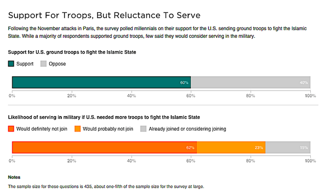 The small print accompanying the graph shows that among Americans ages 18 to 29 who were surveyed, some 60% believe the United States should commit ground forces to fight the Islamic state. And among the same sample group, 62% say they “would definitely not” enlist to join the fight themselves, and another 23% said they “would probably not.”