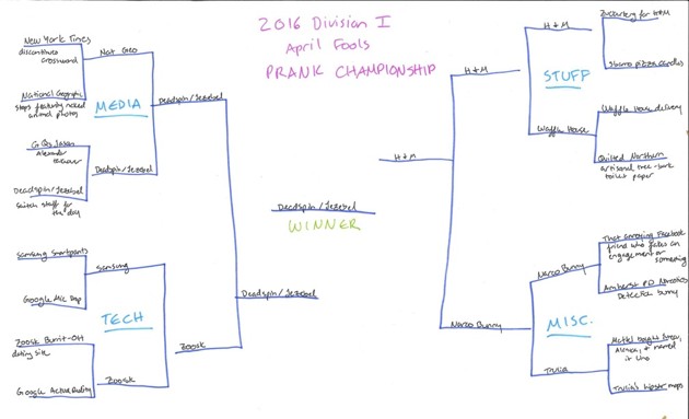 So, of course, we made a bracket about it. We rounded up 16 pranks from 16 #brands and divided them into four categories: media, tech, stuff you can buy, and other, because some pranks are just so special that they defy categorization. Fill it out yourself, if you like! But also know that this is objectively correct and definitive. Enjoy!