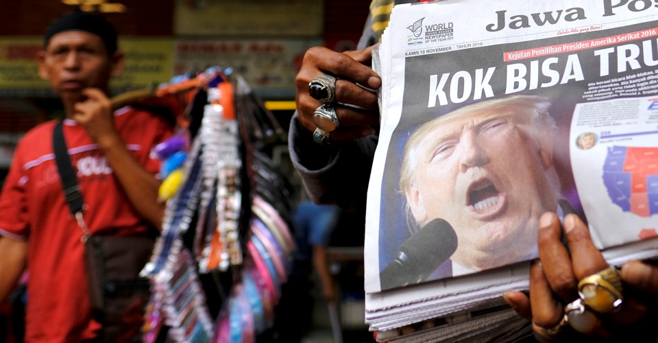 An Indian man in Kolkata reads a Bengali language newspaper with "Trumped" on the front on November 10, 2016.Bikas Das / AP