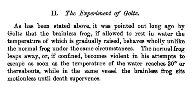 Exception: If the frog you put in the lukewarm water has already had its brain removed, it will sit there unresponsive as the temperature goes up. It was a scientist from Germany who thought to try this experiment, back in the 1800s.