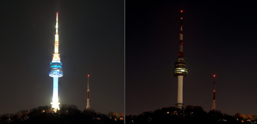 Read moreThis combo of photos shows the Seoul N Tower before (left) and after (right) the lights were turned off for Earth Hour in Seoul, South Korea, on March 26, 2011. Global landmarks around the world went dark on March 26 as "Earth Hour" took place with millions of people around the world switching off their lights. #