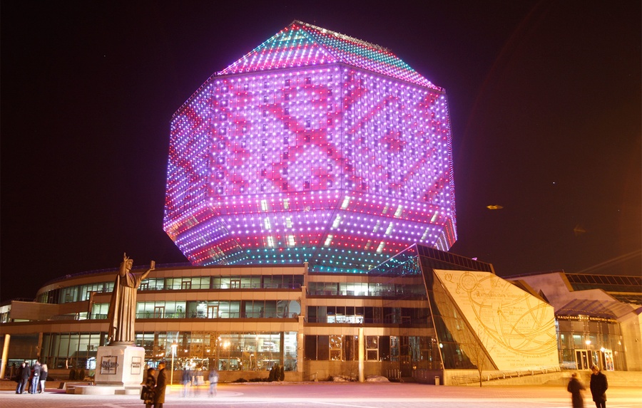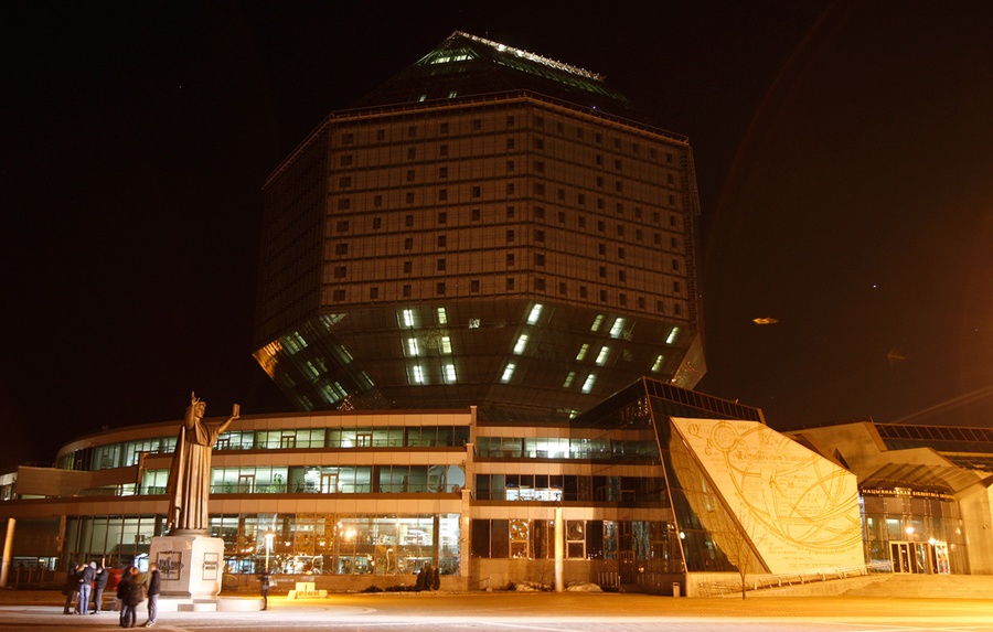 Read moreThe Belarusian National Library during Earth Hour in Minsk, Belarus, on Saturday, March 26, 2011. The monument of Belarusian enlightener Frantsysk Skorina is on the left. [click image to view transition - javascript required] #