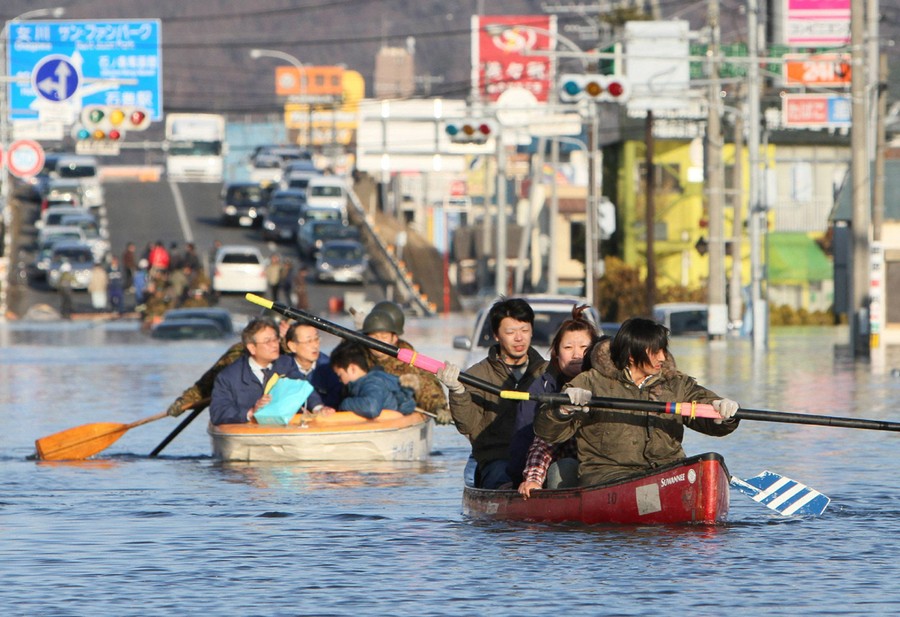 Read morePeople evacuate with small boats down a road flooded by the tsunami waves in the city of Ishinomaki in Miyagi prefecture on March 12, 2011 a day after massive quake and tsunami hit the region. #