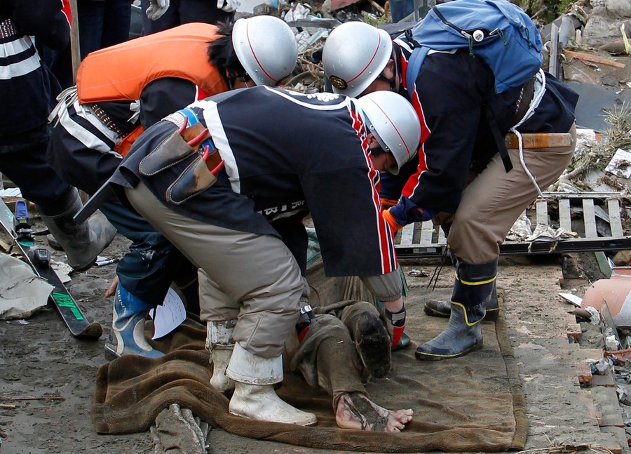 Read moreRescue workers lift the body of a victim from the rubble in Rikuzentakata, northern Japan after the magnitude 8.9 earthquake and tsunami struck the area, March 13, 2011. #