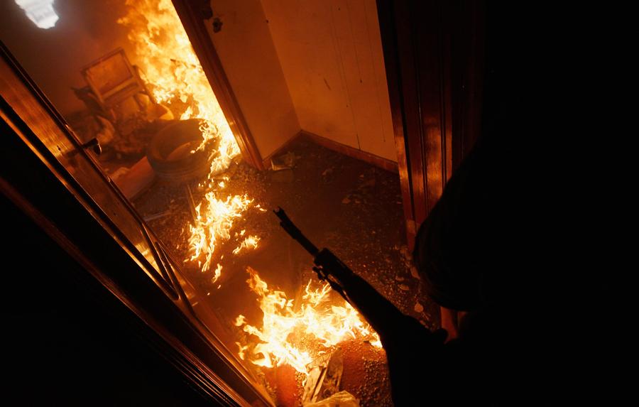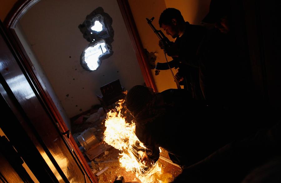Read moreA Libyan rebel fighter covers a burning room containing ensconced government loyalist troops who were firing on them during house-to-house fighting on Tripoli Street in downtown Misrata April 20, 2011. #