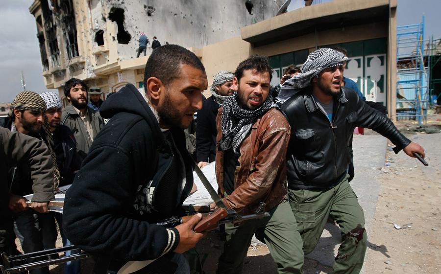 Read moreLibyan rebel fighters carry out a comrade wounded during an effort to dislodge some ensconced government loyalist troops who were firing on them from a building (background) during house-to-house fighting on Tripoli Street in downtown Misrata April 20, 2011. #