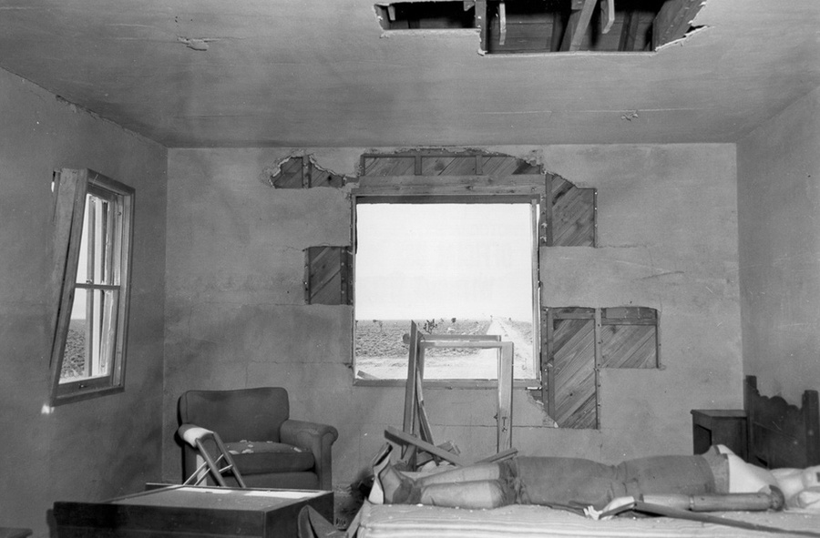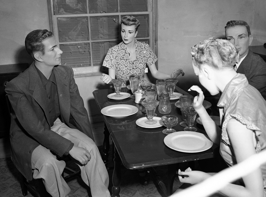 Read more(1 of 2) In Operation Doorstep, conducted during the larger Operation Upshot-Knothole nuclear bomb test, mannequins are seated at a table in the dining room of house number two, attending a "dinner party" thrown by Civil Defense officials who are testing the effects of an atomic explosion on houses and occupants on March 15, 1953. #