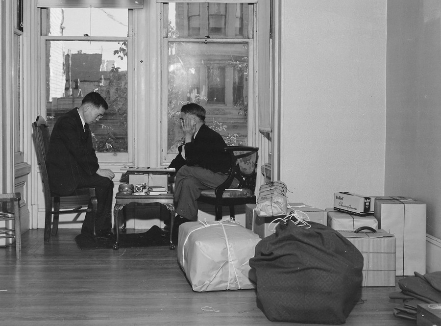 Read moreTwo plainclothes men, left, watch as Japanese aliens are removed from their homes on Terminal Island, a vital Naval and Shipbuilding center in Los Angeles, California, on February 3, 1942. Some 400 male Japanese aliens -- Terminal Island residents -- were rounded up early on February 2 by 180 federal, city and county officers. #