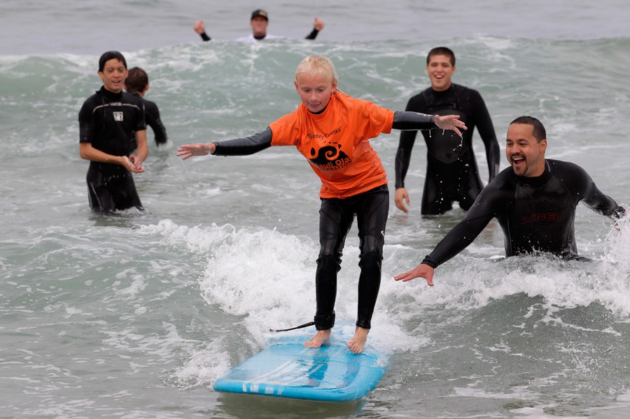 Read moreVolunteer surf instructors cheer as 9-year-old Morgan Farrier, who is diagnosed with cystic fibrosis, stands up on a surfboard during the Mauli Ola Foundation's Cystic Fibrosis Surf Experience Day in Redondo Beach, California, on June 18, 2011. #