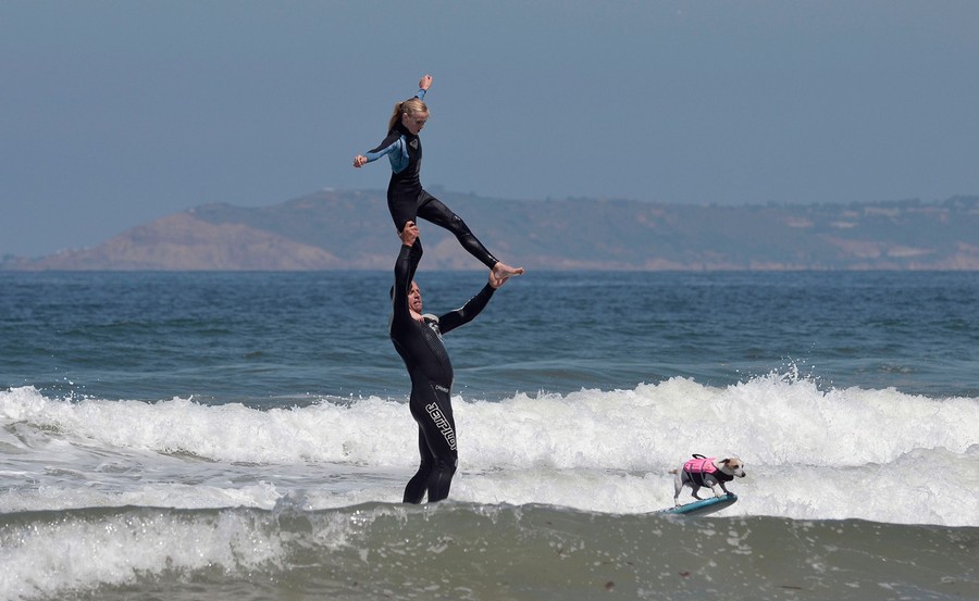 Read moreSurfer Scott Chandler holds his daughter Tyler aloft as their dog Zoey rides on the front of their board during the Loews Surf Dog Competition in Imperial Beach, California, on June 4, 2011. #