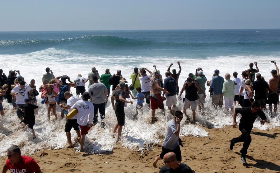 Read moreSpectators watch as body surfers wait to catch big waves in Newport Beach, California, on September 1, 2011. Authorities had warned that dangerously high waves were arriving from a winter storm off New Zealand. #