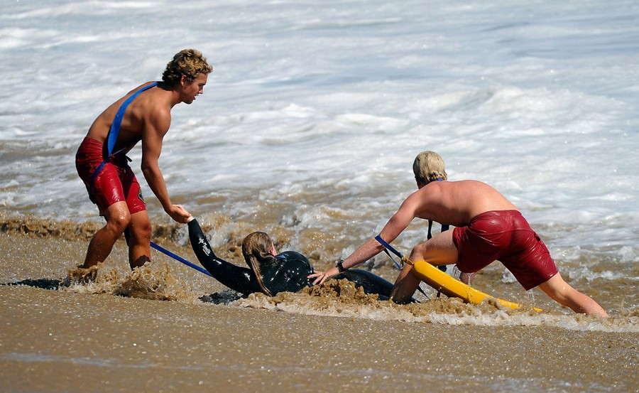 Read moreLifegaurds help pull a woman out of the ocean as high waves measuring up to 20 feet pounded the beach at the Wedge on September 1, 2011 in Newport Beach, California. A winter storm off the coast of Australia and New Zealand brought unusually high surf to the Southern California beaches. #