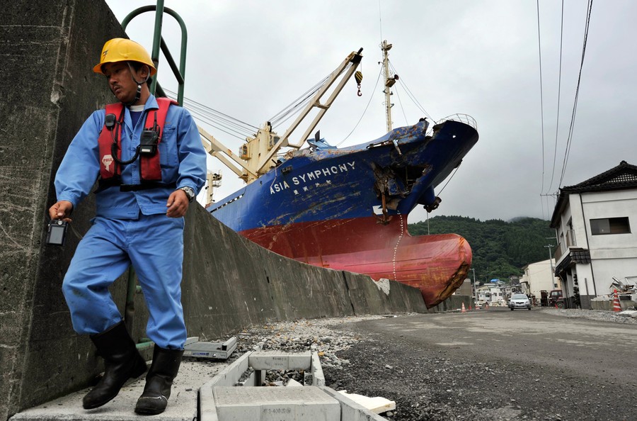 Read moreA worker walks past the grounded cargo ship Asia Symphony, which was pushed onto the harbor wall in Kamaishi port by the tsunami of March 11, in Kamaishi, on August 24, 2011. Efforts to remove the Panama registered 4,724-ton freighter will be finished this October when it is returned to the sea by a marine crane, following repairs. #