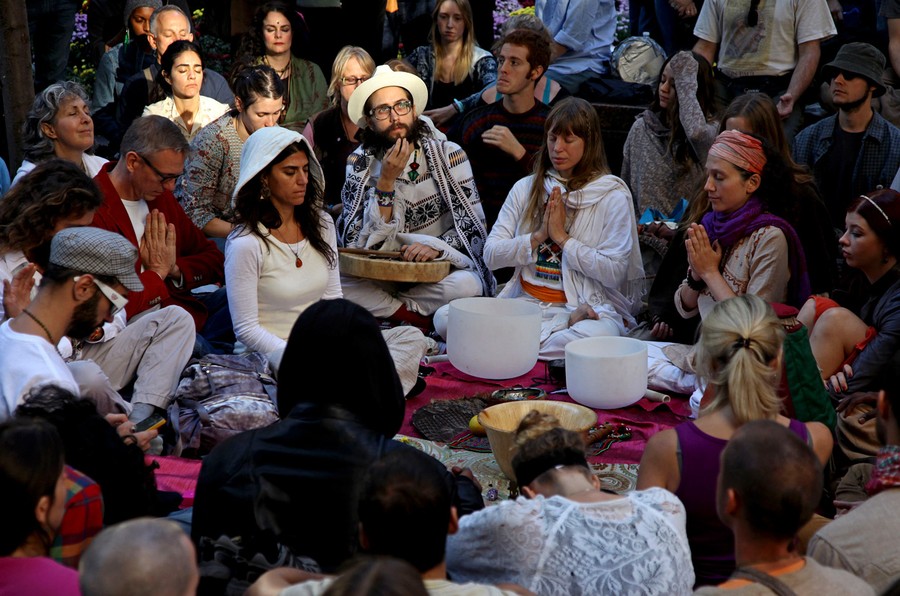 Read morePeople with the Occupy Wall Street protest in Zuccotti Park form a circle and meditate on October 5, 2011 in New York. The Occupy Wall Street protests started Sept. 17 with a few dozen demonstrators who tried to pitch tents in front of the New York Stock Exchange. Since then, hundreds have set up camp nearby in Zuccotti Park and have become increasingly organized, lining up medical aid and legal help and printing their own newspaper. #
