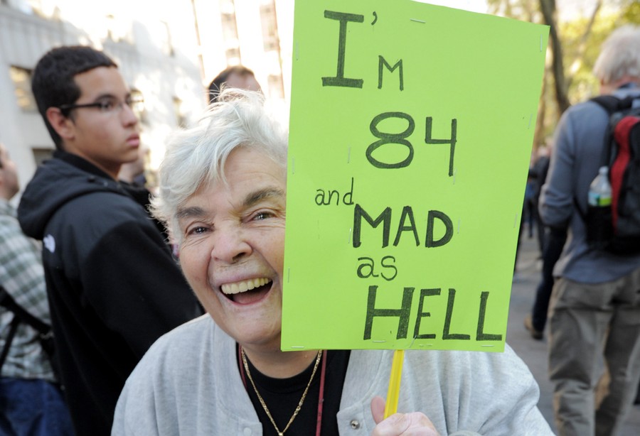 Read more85-year-old Julia Botello and two other protesters chant as they leave a Bank of America just before police begin arresting demonstrators for occupying its lobby on October 6, 2011 in Los Angeles, California. The demonstrators are marching to major bank offices to protest the role of Wall Street banks in the federal budget crisis and in solidarity with protesters in New York and other US cities. #