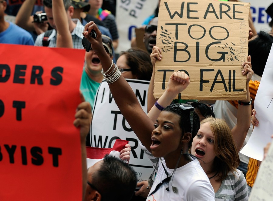 Read moreA man shouts slogans as protesters occupy a Bank of America branch during a "Make Wall Street Banks Pay" protest march in Los Angeles, California, on October 6, 2011. Los Angeles Police said they arrested eleven people for trespassing at the branch. #