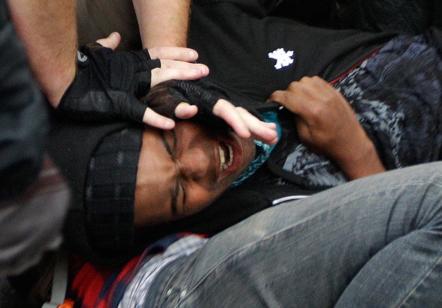 Read moreA protester screams as a Seattle Police officer pushes down on his head, on October 5, 2011, as police try to remove a tent pitched in downtown Seattle's Westlake Park during an "Occupy Seattle" protest. #