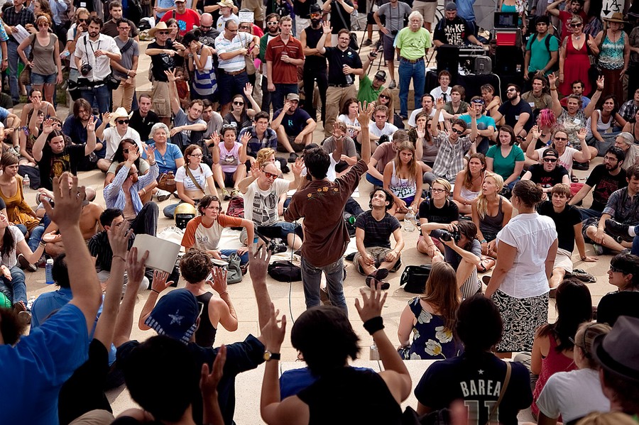 Read moreJoshua Whisenhunt, a volunteer facilitator for the first day of Occupy Austin, instructs a crowd outside city hall about communicating with hand signals on Thursday afternoon October 6, 2011 in Austin Texas. #