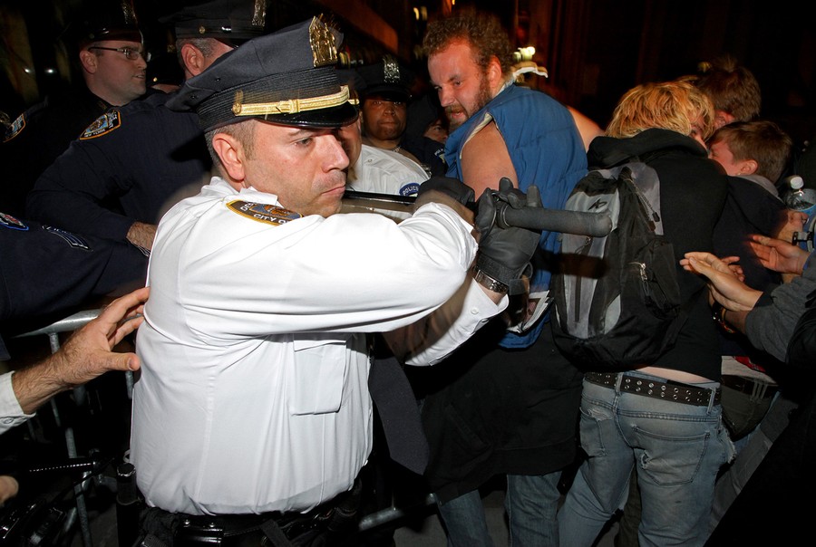 Read moreA New York City police lieutenant swings his baton as he and other police try to stop protesters who breached a barricade to enter Wall Street after an Occupy Wall Street march on October 5, 2011 in New York. #