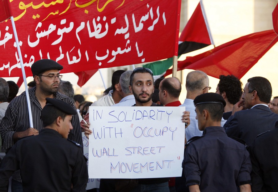 Read moreA Jordanian protester carrying a placard readin in English, "in Solidarity with 'Occupy Wall Street Movement'" stands outside the US embassy as members of the Communist Party gather at one of a number of protests around the world in Amman, Jordan, on October 15, 2011. The banner behind him, which is partially obscured, reads, "Jordanian Communist Party, capitalism is vicious and a known threat to humanity." #