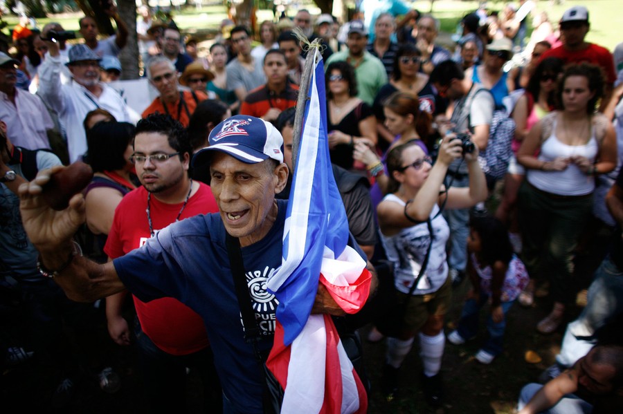Read moreA demonstrator speaks as he holds a Puerto Rican flag during the Occupy Puerto Rico protest in San Juan, Puerto Rico, on October 15, 2011. About 200 people in Puerto Rico gathered in a financial district dubbed "The Golden Mile" to protest capitalism and government cuts as part of worldwide demonstrations. #