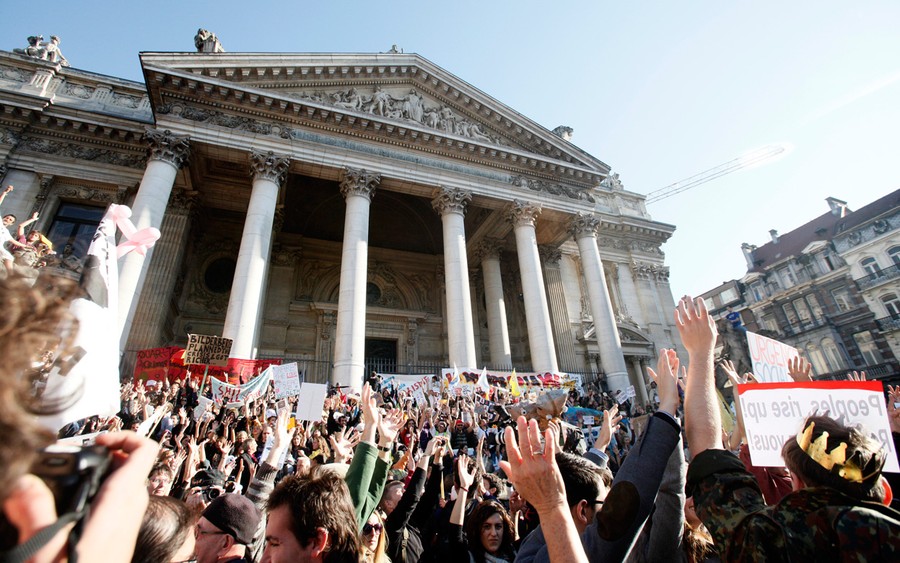 Read more"Indignant" demonstrators stage a protest in front of the Stock Exchange in Brussels, on October 15, 2011. Demonstrators rallied on Saturday across the world to accuse bankers and politicians of wrecking economies. #