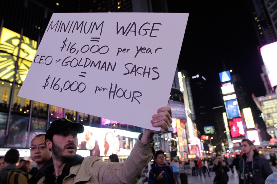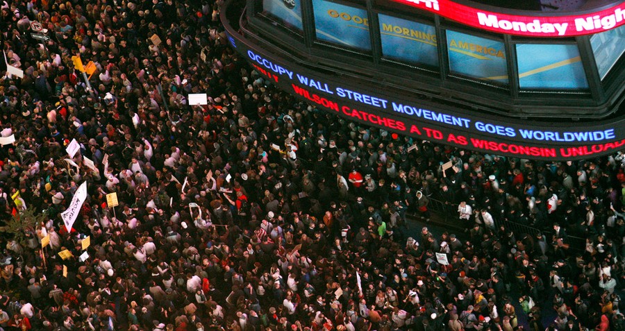 Read moreOccupy Wall Street protesters shout slogans during a protest at Times Square in New York, on October 15, 2011. Thousands of anti-Wall Street protesters rallied in New York's Times Square on Saturday, buoyed by a global day of demonstrations in support of their monthlong campaign against corporate greed. #