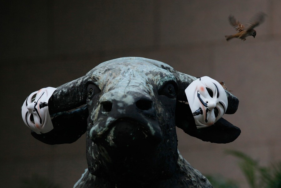 Read moreA bird flies above a bronze statue of a bull where protesters left Guy Fawkes masks during an "Occupy Hong Kong" rally outside the Hong Kong Exchange Square, on October 15, 2011. A group of people gathered in support of "Occupy Wall Street" and the Occupy Movement around the world. #