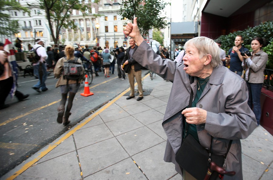 Read moreAddie Becker, right, cheers as demonstrators march through center city Philadelphia, on October 14, 2011, in the Occupy Philly protest. The encampment at City Hall is one of many being held across the country recently in support of the ongoing Occupy Wall Street demonstration in New York. #