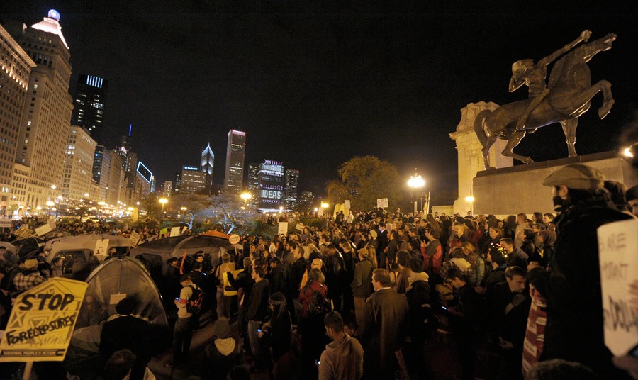 Read moreIn this photo taken Saturday, October 15, 2011, protesters take part in a march and rally at Michigan and Congress in Chicago, Illinois for the Global Day of Occupation. About 2,000 people participated Saturday in an Occupy Chicago demonstration, and about 500 pitched tents in Congress Plaza that evening. Chicago police say the protesters were told to remove their tents and leave the park when it closed at 11 p.m. When they refused, police began cutting down the tents and making arrests. #