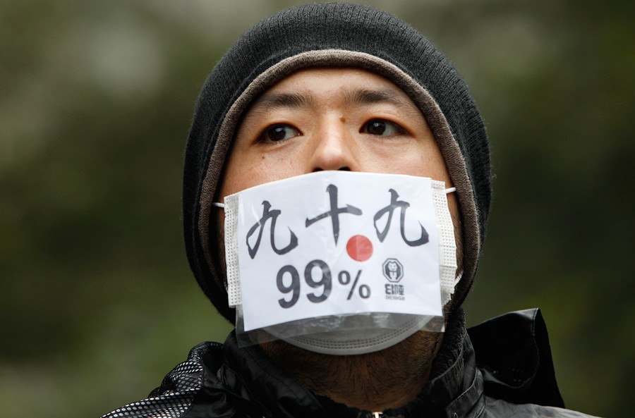 Read moreAn Occupy Tokyo protester wears a mask during a rally in Tokyo, on October 15, 2011. Protesters worldwide geared up for a cry of rage on Saturday against bankers, financiers and politicians they accuse of ruining global economies and condemning millions to poverty and hardship through greed. Galvanised by the past month's Occupy Wall Street movement, they plan to take to the streets from Sydney to Alaska via London, Frankfurt, Washington and New York. The characters on the mask, "99%", stemmed from the Occupy Wall Street movement, is a reference to the idea that the top 1 percent of Americans have too much. #
