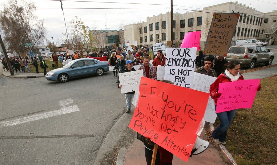 Read morePeople make their way along Cushman Street during the Occupy Fairbanks march through downtown Fairbanks, Alaska, on October 15, 2011. Hundreds of people turned out for the event to show their concern and disapproval for the government. #