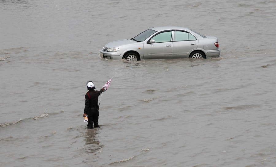 Read moreThai motorists travel through a flooded street during a heavy monsoon downpour in Bangkok, on September 3, 2011. Dozens of people have died in northern Thailand over the past few weeks in floods that have also affected over a million people. #
